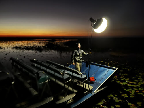 A behind-the-scenes shot of the film “Christmas in Ochopee” Pictured: Carlos Arroyo, a gaffer for the film. The film, along with other WEG productions, will be screening at the event. (Photo Courtesy of White Elephant Group)