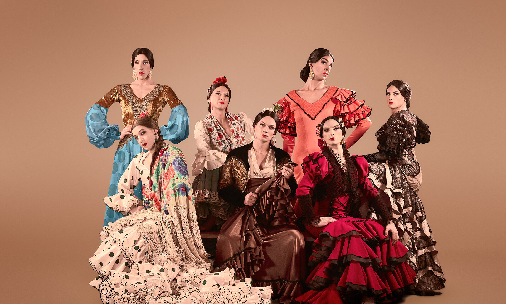 In Compañía Mañuel Liñán, the male dancers shed the traditional tight-fitting trousers, short black jackets and brimmed hats. They instead adopt the traditional costumes of flamenco female dancers, wearing “trajes de flamenca” — brightly colored dresses trimmed with ruffles, plus shawls loosely arranged over their shoulders. They snap out flamenco’s iconic rhythms sporting black strapped flamenco shoes with 3-inch heels embedded with nails.