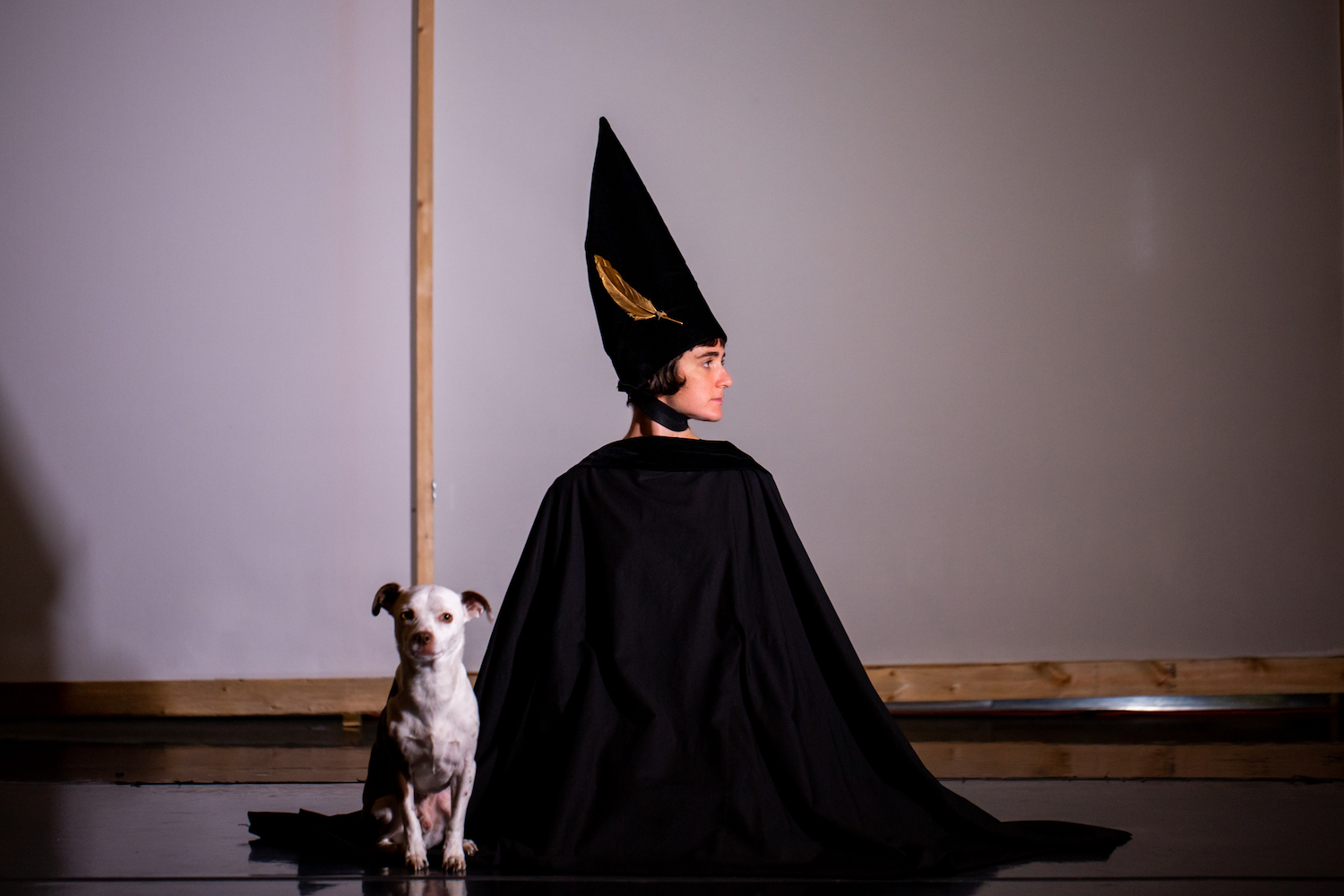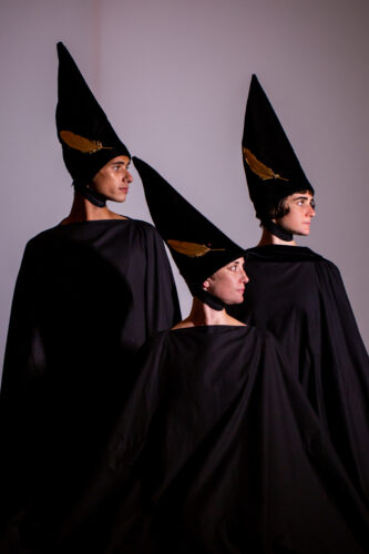 The video ends. The dancers do a quick costume change, donning black robes and velvet black hats angled like a tuft of feather on the head of a bird. Each hat has a gold feather sewn into its side. The performers line up on the far side of the studio, facing away.