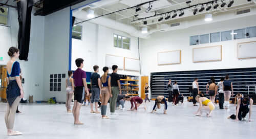 “Sometimes it’s just a gesture,” Claudia Schreier says. Here, with MCB dancers during a rehearsal of “The Source.” (Photo courtesy of Alexander Iziliaev)