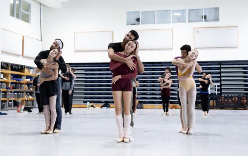She confesses she’s arrived at rehearsals with “a 50-page Google document with each grade counted” but acknowledges that “you have to leave room for adjustments” and adds, “sometimes it’s just a gesture.” In this case, she thought it was beautiful how someone was hugging someone in the back of the room during one of the rehearsals. Then she did her own version of it, which was incorporated into the piece.