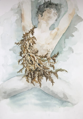 Sargassum seaweed lends its golden look to Puck’s pearled costume of soft leather and organza, adding beauty to his mischief in a costume design by Michele Oka Doner. (Photo courtesy of Michele Oka Doner)