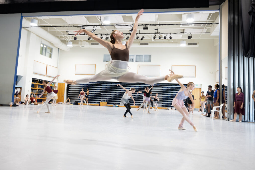 Taylor Naturkas leaps through the air in rehearsal for Miami City Ballet’s “A Midsummer Night’s Dream.” Choreography by George Balanchine © The George Balanchine Trust. (Photo courtesy of Alexander Iziliaev/Miami City Ballet)