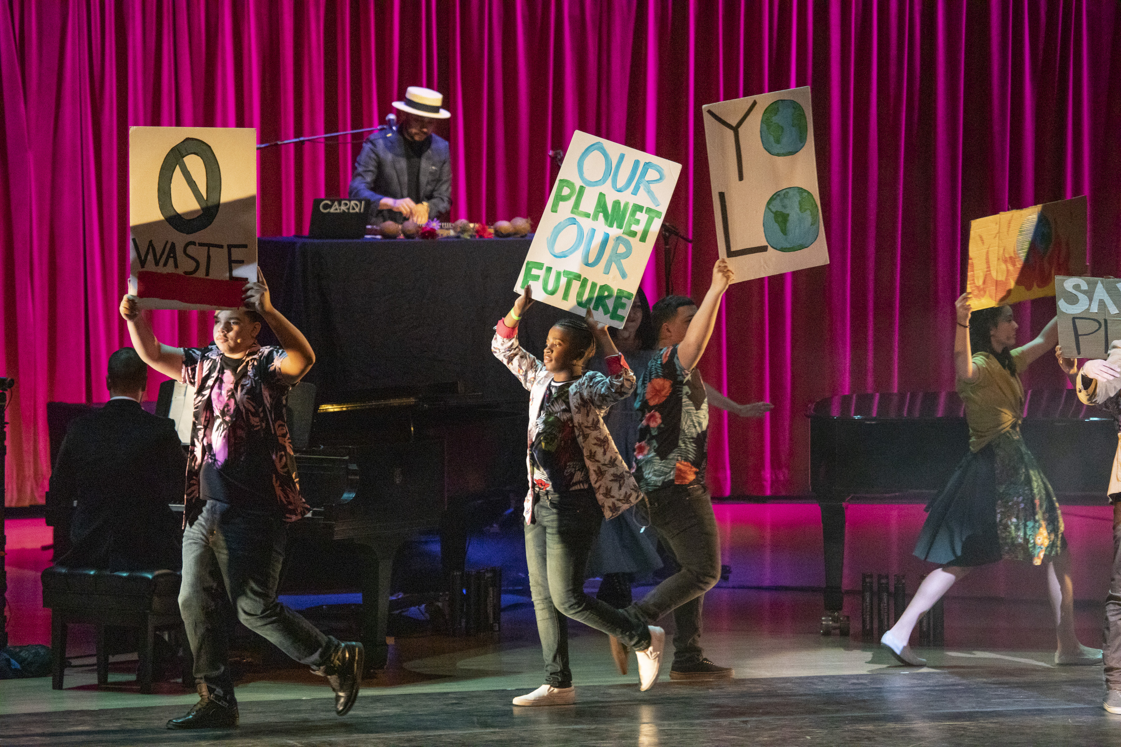 Other students criss-crossed the stage, fanning scattered papers into the air, as she delivered lines like, “This city is getting grayer and grayer/with its advanced machinery/my green leaves try to keep the atmosphere healthy/aiming to keep the air clean and fresh.”
