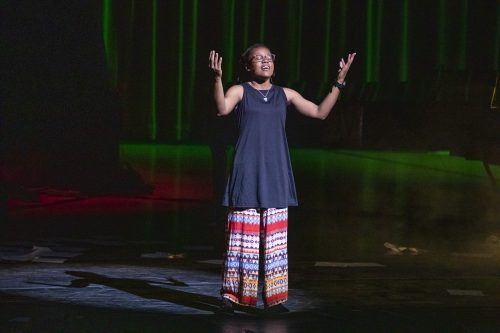 In the first of several numbers choreographed by Miami dancer Rosie Herrera, 20 students carrying flashlights circled four young soloists who freestyle-danced at the front of the stage. As the number came to a close, Miami Norland Senior High 12th-grader Anaisa Tate stood at the center, gently swaying as she laid down the lines of her poem, “Crossroads.”