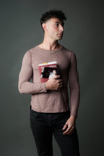 Portrait of Pioneer Winter, holding a notebook and a photo of his mom with her African grey, for “In the Belly of the Bird/Godmother.” (Photo by Chantal Lawrie, courtesy Pioneer Winter Collective)