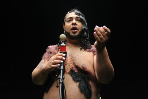 We see Josue Garcia, imperiously large, swelling pectoral breasts outlined by feathers, belly curving over a bikini, and hear him curse his mother for abandoning him. “Why did you leave me?! Why didn’t you love me?” In the past, or just now?
