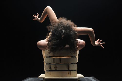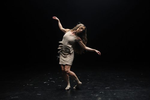 The finale sees the other seven performers together onstage, no film. They sway, circle, reach, arch, clump together and spin apart, crouch on the three amplified platforms to scratch up sounds (another of Kojš’ inspirations). The section seems like a structured improvisation, and while the dancers’ fierce commitment carries the dance, the moment also feels meandering. And yet, it also fits. As if they’ve ventured out of their isolated pandemic film cells into the world: uncertain, chaotic, and anxious – but filled with the energy of coming together.