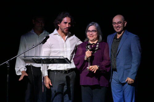 Ruby Romero-Issaev receives “A Life for Dance Award” on behalf of Arts Ballet Theatre of Florida Artistic Director, Vladimir Issaev, from David Camorlinga, left, and IBFM Artistic Director, Eriberto Jimenez, right. (Photo courtesy of Simon Soong)