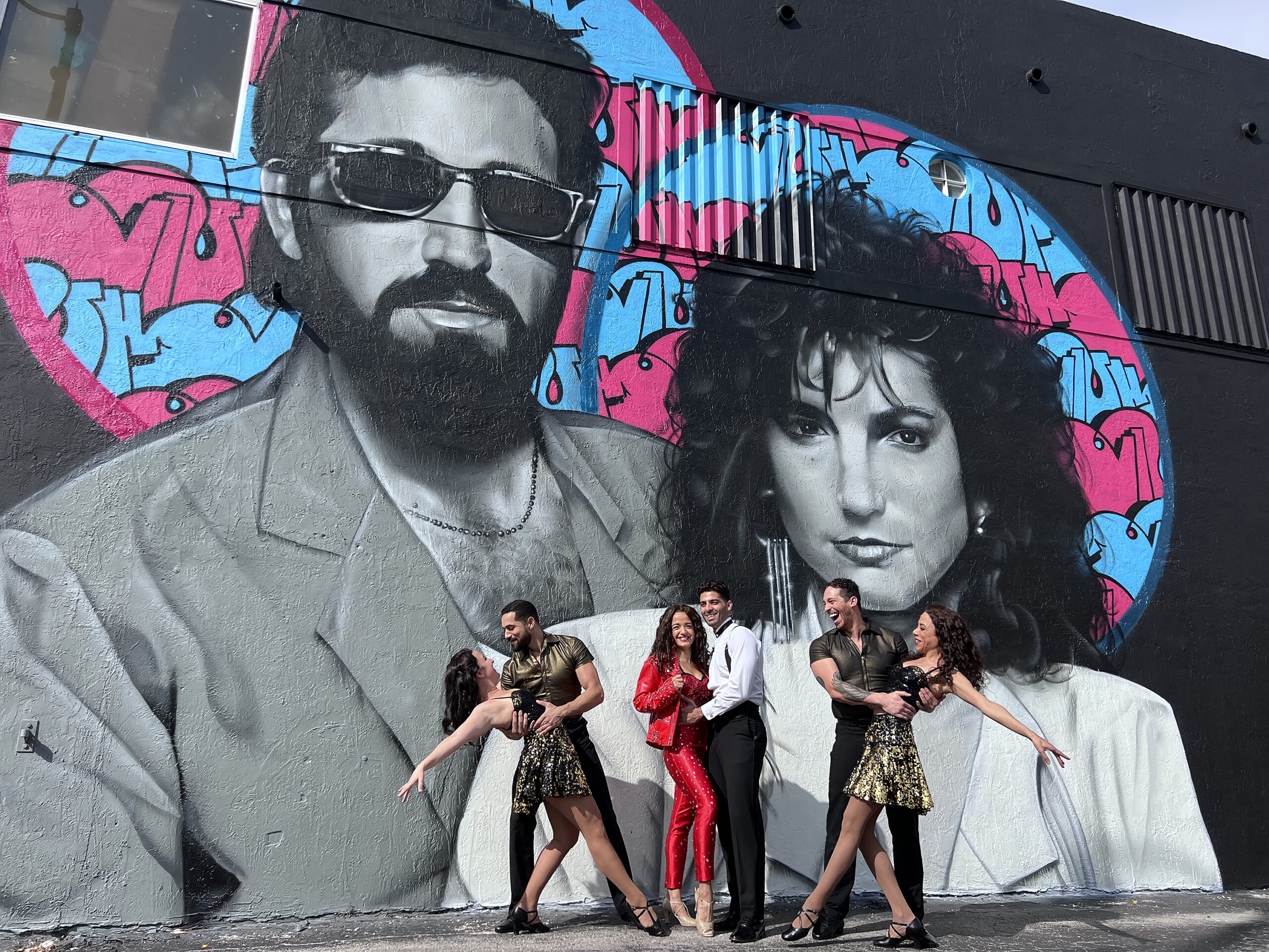 Actors’ Playhouse ON YOUR FEET! cast members Natalie Caruncho, Hector Maisonet, Claudia Yanez, Jason Canela, Jeremey Adam Rey and Alejandra Matos pose in front of local artist Disem’s new mural of the Estefans located at La Casa De Los Trucos. (Photo/Brooke Noble)