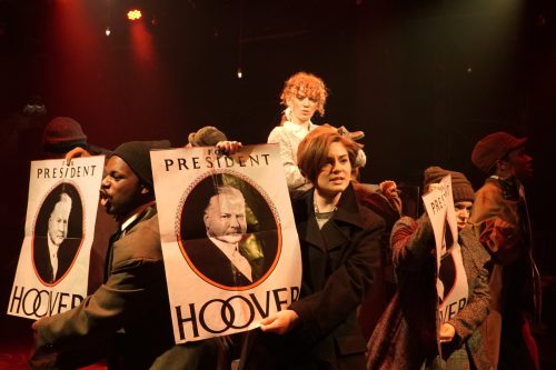 The residents of a Hooverville homeless encampment sing the sarcastic “We’d Like to Thank You, Herbert Hoover” in Area Stage’s “Annie.” Photo courtesy of Giancarlo Rodaz)