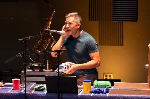Dan Froot in “Arms Around America.” The live radio drama, presented by Dan Froot & Co., Live Arts Miami and Miami Light Project, examines America’s relationship with guns. (Photo courtesy of Bailey Holiver)