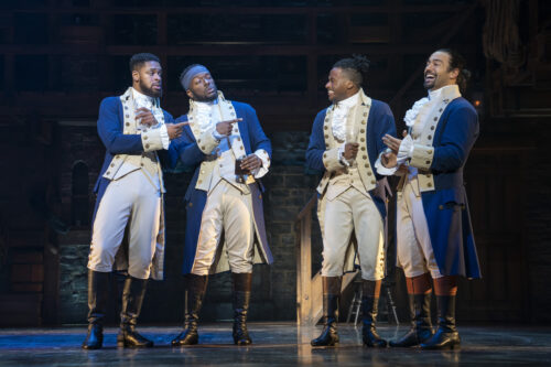 From left, Warren Egypt Franklin, Desmond Sean Ellington, Elijah Malcomb, and Pierre Jean Gonzalez in the national touring company of “Hamilton.” (Photo by Joan Marcus, courtesy of the production)