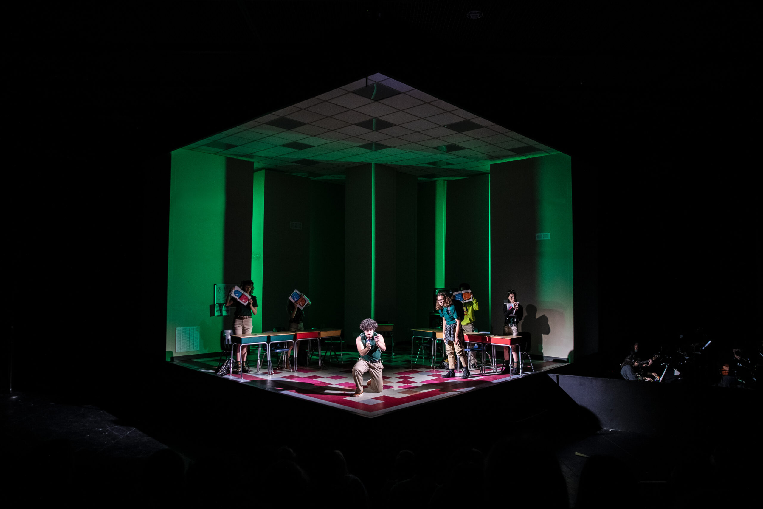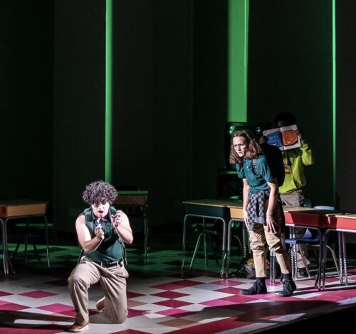 Frank J. Oliva’s set is a flexible version of a high school classroom, complete with linoleum floor, easy-to-move desks (and walls, the better to allow the cast to dance to Irma Becker’s choreography) and a deliberately institutional look. The lighting by Cheyenne Sykes helps alter the environment so that “school” changes into a brightly colored party place, or so that it reflects the effect that green and red Mountain Dew is having on the students (see the show if you want to get that bit).
