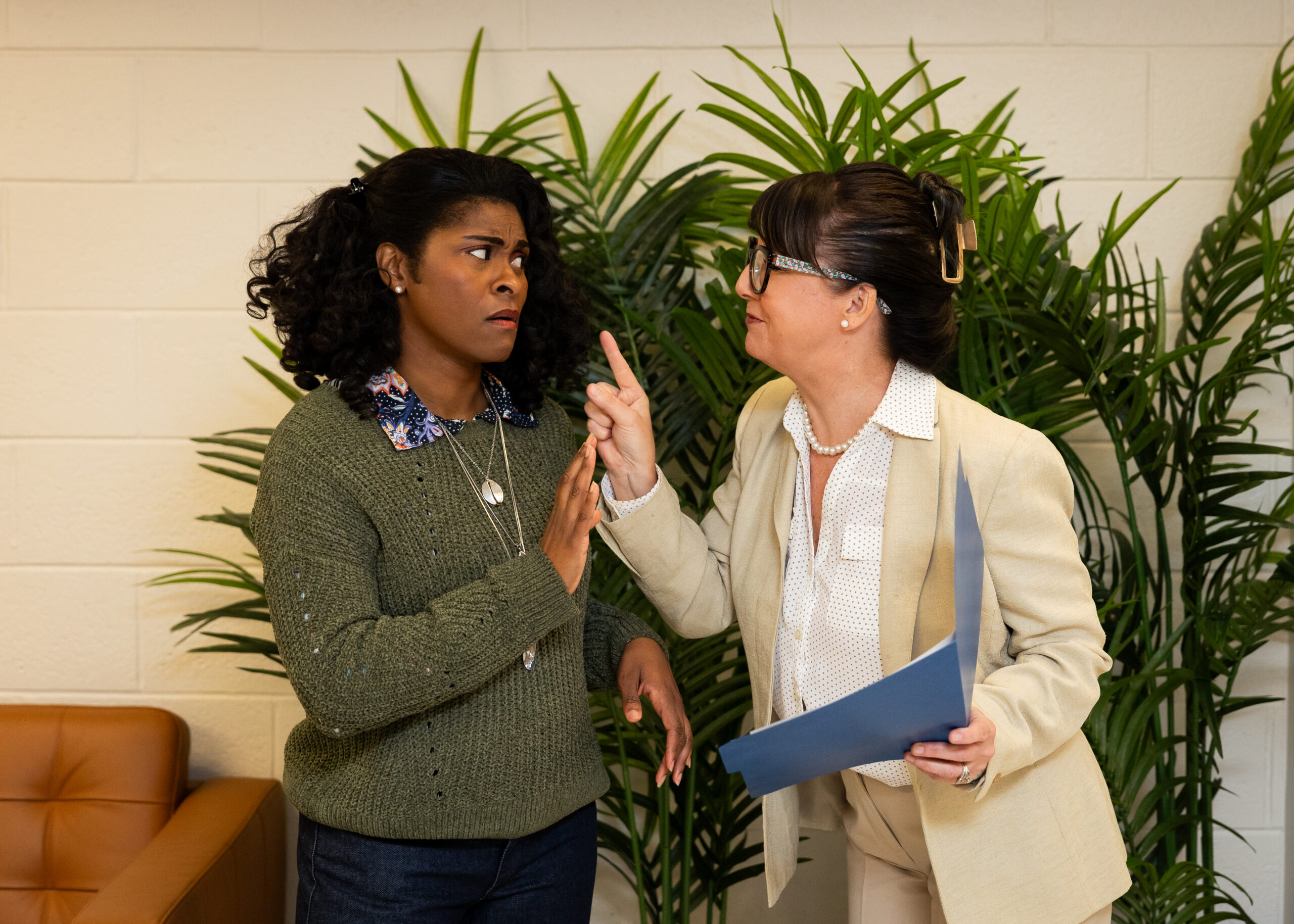 Rita Cole as Patrice Patterson and Niki Fridh as Principal Ward in City Theater’s premiere of Aaron Mays’ “Black Santa” opening Thursday, Dec. 5 through Sunday, Dec. 22 in the Carnival Studio Theater at the Adrienne Arsht Center, Miami. (Photo courtesy of Morgan Sophia Photography)
