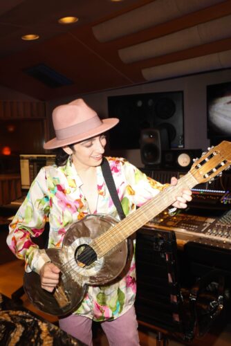 Emily Estefan plays one of the recycled guitars. She’s co-writing the music and lyrics for the musical “Basura” based on the Recycled Orchestra of Cateura. (Photo by Jose “Chepe” DeVillegas, courtesy of Estefan Enterprises, Inc.)