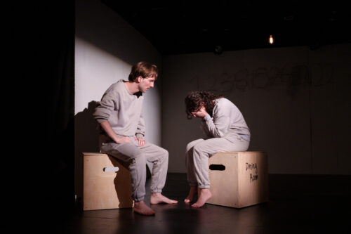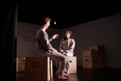 A man and woman dressed alike – gray non-descript sweatshirts and sweatpants – are already on stage as the audience settles in for LakehouseRanchDotPng’s production of Robert Kerr’s “Have You Seen Boomer?”