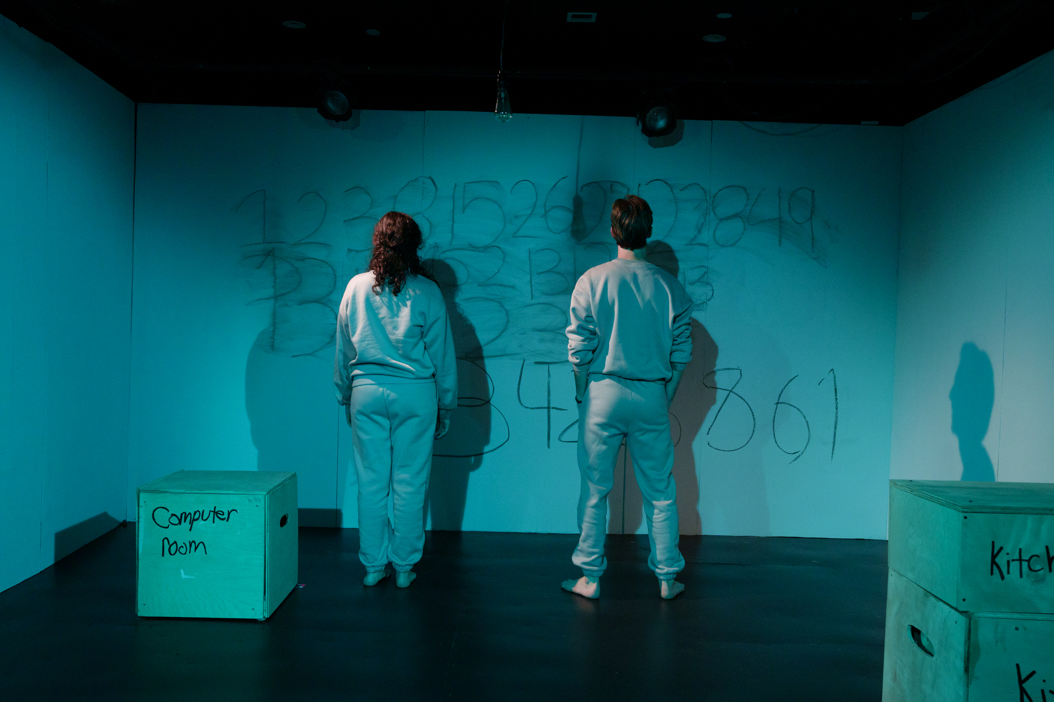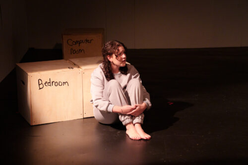 When the lights go up, we see that there are multiple wooden cubes on stage. Handwritten in black marker on each are identifiers of rooms in a house – kitchen, dining room, bathroom, computer room.
