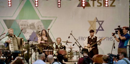 From left, Reuwen”Ruby”  Sosnowicz and daughter Chana Rose Sosnowicz with Saul Dreier and Jeff Black at a concert in Warsaw, Poland, in 2016. Filmmaker Tod Lending is at right. (Photo courtesy of Tod Lending)