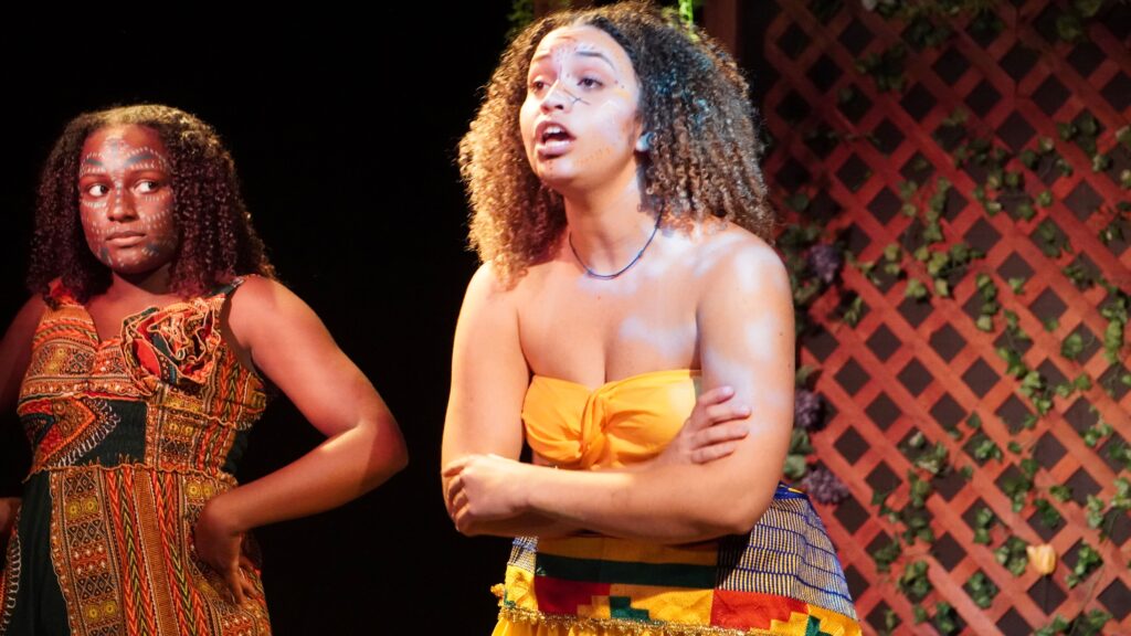 Brette Raia Curah and Chantal Mendoza as Village Girl and Ama in ‘OSKUNERU 2025: A Theatrical Journey Through the History of the Surinamese Maroons.’ (Photo courtesy of Elijah Pestatna )