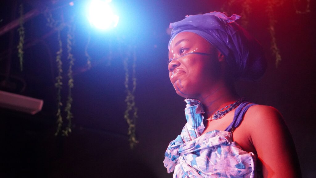 Henry Cadet as Akosua in Miami-born and Suriname-raised playwright Sefanja Richard Galon’s “OSKUNERU 2025,” opening at MDC’s Art Lab on Thursday, Feb. 6 through Saturday, Feb. 15. (Photo courtesy of Elijah Pestatna)