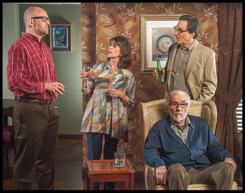 From left, Gregg Weiner, Patti Gardner and George Schiavone (seated), shown with David Kwiat in GableStage’s “If I Forget,” which will launch the new season in “The Price.” (Photo courtesy of George Schiavone)