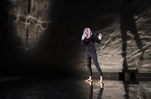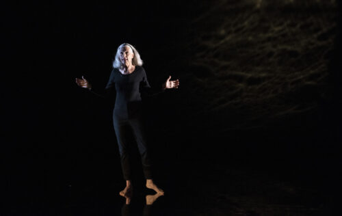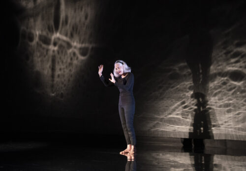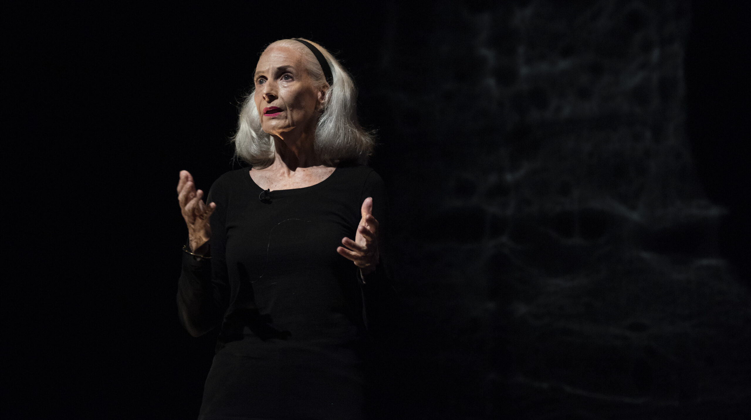 Producing artistic director Bari Newport and her creative collaborators imagine Didion, here portrayed by Sara Morsey, speaking from inside a void – a void representing the magical thinking that helped carry her through her first year as a widow. From the reflective black floor to dark walls that become a canvas for the projection of abstract images, the space is a physical manifestation of the darkness that can afflict a survivor after a profound loss.