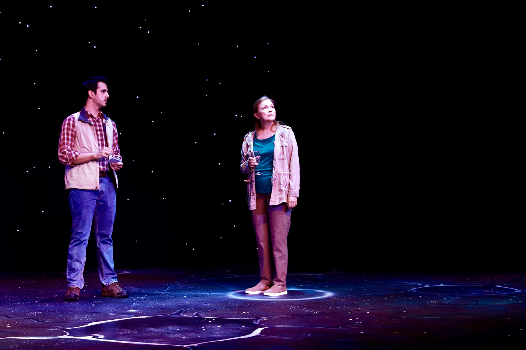 The floor is painted black (all of this presents the space in a quasi-Black Box type setting) with different celestial shapes. Brandon M. Newton did the scenic design, Jodi Dellaventura the set dressing and properties. Eric Nelson designed the lighting and Ellis Tillman the costumes. Reidar Sorensen’s sound – ranging from crickets chirping to atonal violin music – creates atmosphere.