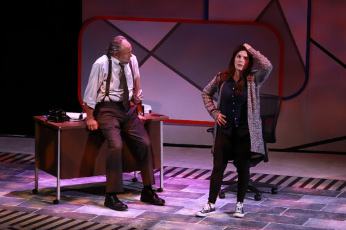 The minimalist setting by Brandon M. Newton consists of a backdrop that resembles puzzle pieces, a constant reminder of Rachel’s jumbled memory. Different areas of the stage are playing areas for locales Rachel’s untidy flat; the Hipwell’s house (with a bar cart as its centerpiece); Tom and his new wife’s place; the two chairs that represent the therapist’s office; and the detective’s workspace.
