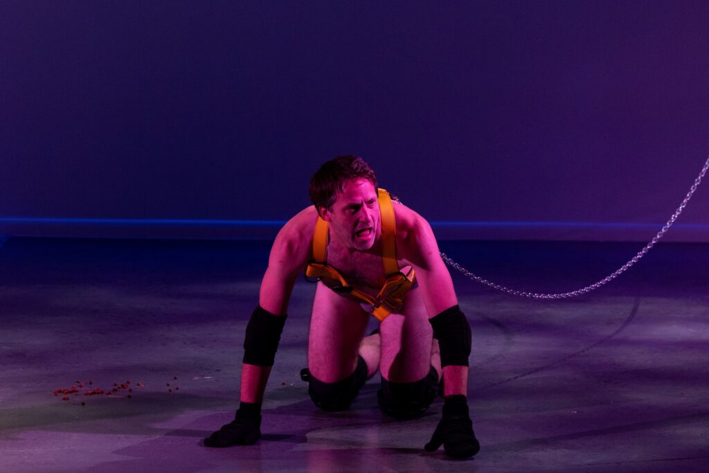 Caleb Scott as David, a performance artist, who lives as a dog in a gallery for a month in Harley Elias’s “Bad Dog” at Miami New Drama. (Photo by Morgan Sophia Photography/courtesy of Miami New Drama)