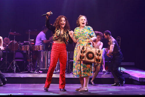 Claudia Yanez as Gloria Estefan welcomes Alma Cuervo as her grandmother, Consuelo, to the stage in “On Your Feet!” (Photo/Alberto Romeu)