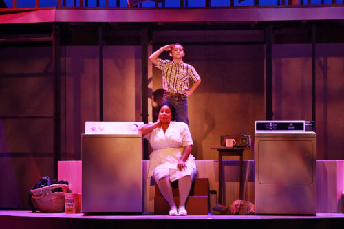 Brandon M. Newton’s set design captures the characters’ different worlds: at the very top of a revolving stage is Noah’s bedroom, while at the bottom is the basement laundry room where Caroline Thibodeaux (the astounding Kareema Khouri), the family’s 39-year-old Black maid, toils daily.