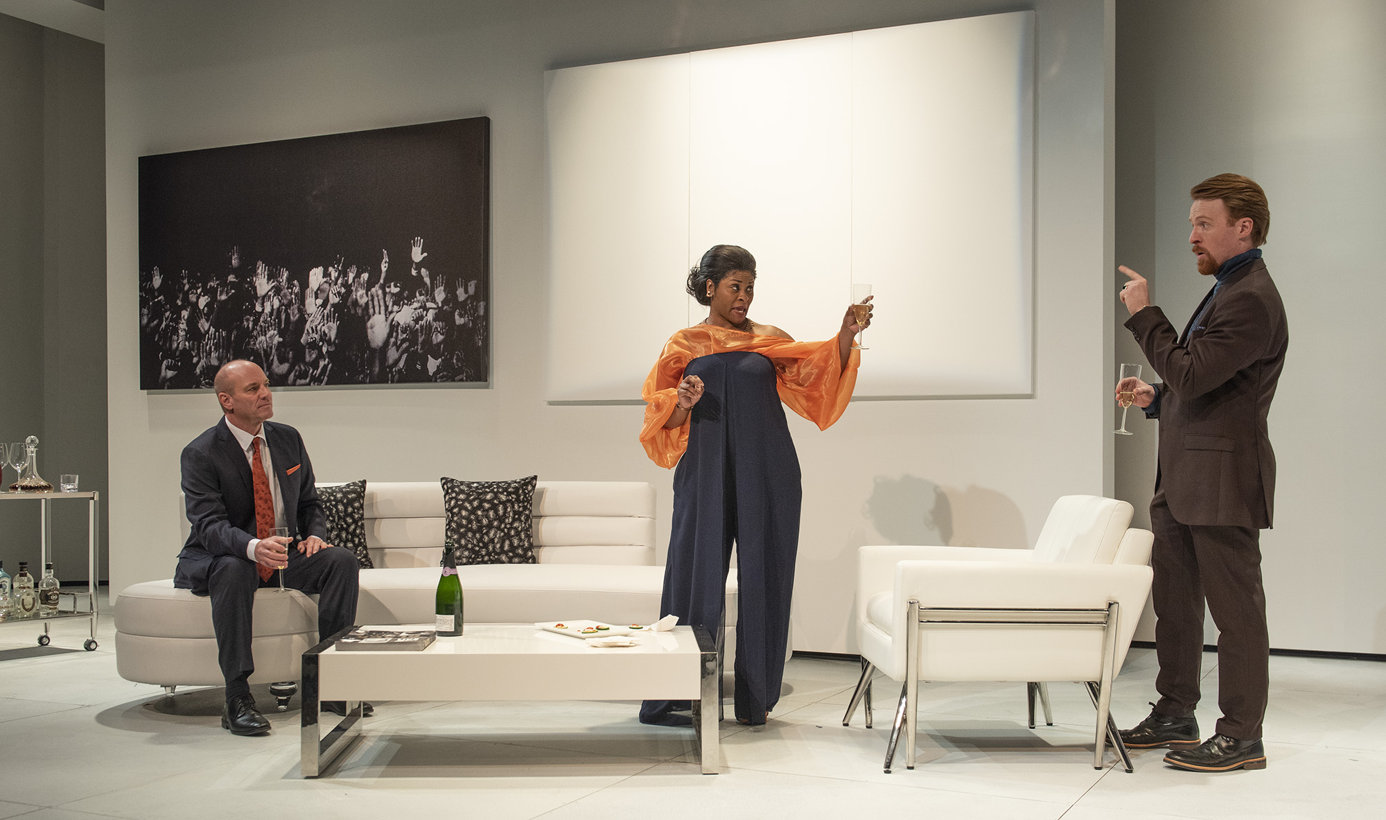 The characters played by Tom Wahl, Rita Cole and Iain Batchelor have a discussion over bubbly in GableStage’s “The White Card.” (Photo/Magnus Stark)