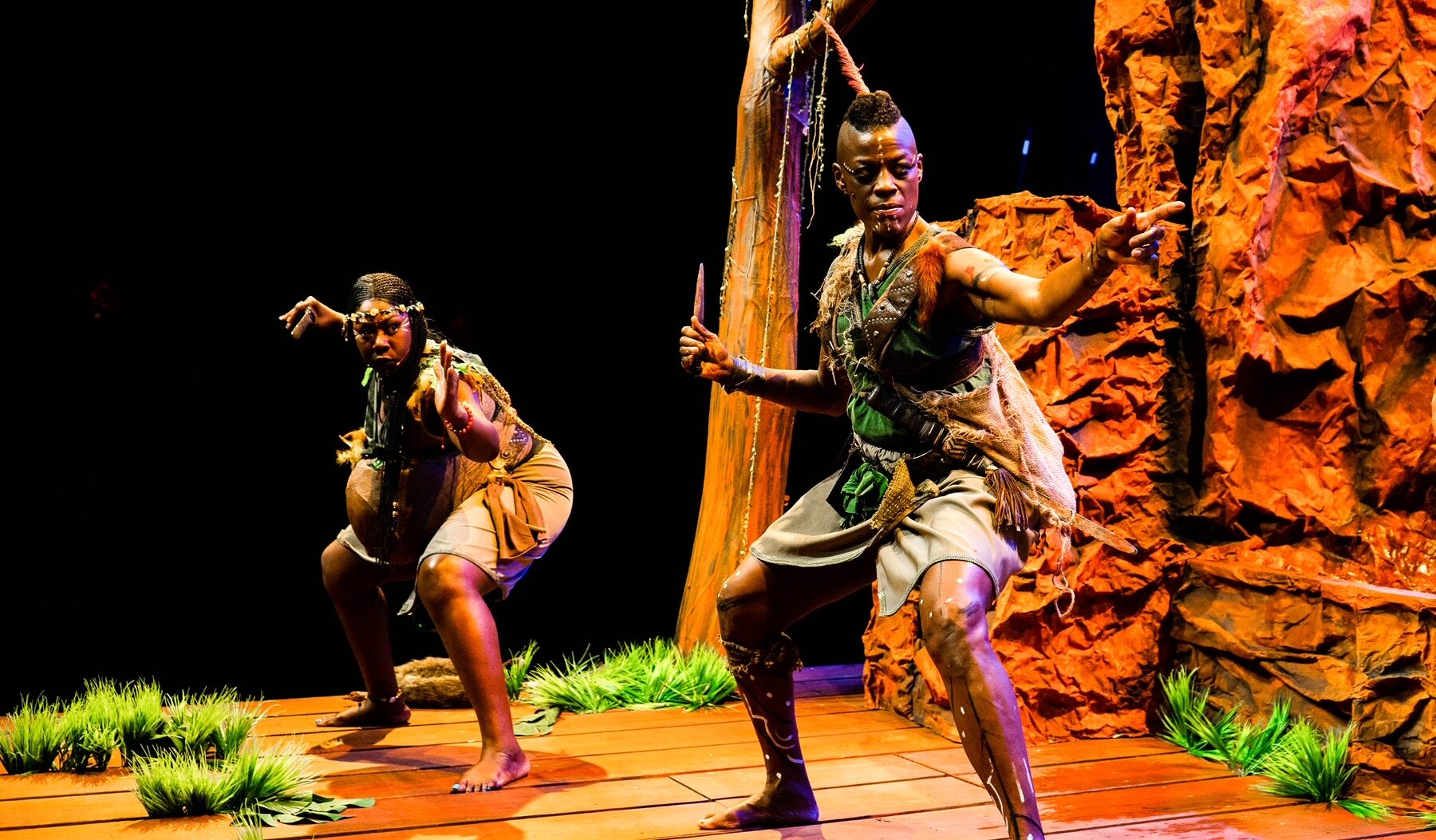 Set, lighting and projection designer Mitchell Ost creates a multilevel playing area complete with a small waterfall, which mixes with music, the sound of crickets and the cries of animals. Costume designer Dunia Pacheco makes the women look ready for combat and the men appear ready to colonize (except for that hat). Fight choreographer Diego Villada keeps the actors safe as they battle with a slightly restrained ferocity.