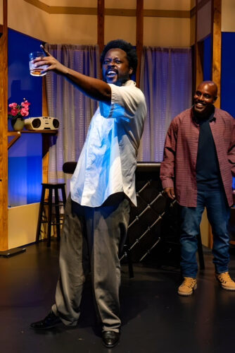 Charlie Thompson (Jean Hyppolite) toasts with a drink of Jack Daniels to new friend Tyrone (Charles Reuben) as they trade stories. (Photo courtesy of Chasity Hart)