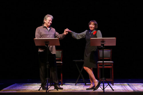 Instead of having the actors learn their lines and perform the play on a traditional set, Clancy and director Seth Greenleaf place their stars on a stage sporting nothing more than four chairs, a pair of tables holding tissues and water, and four music stands holding scripts. The actors – Didi Conn, Adrian Zmed, Loretta Swit and Donny Most – read their dialogue and interact as performers at staged readings do, smoothly referencing the text as they find connective moments with each other.