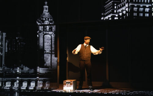 For the set panels themselves, they join together like a jigsaw puzzle to create different configurations, spaces, and streets, homes, boardrooms, each choreographed with perfect timing by four crew members responsible for the set’s movements. Sound designer Sean McGinley’s original score that plays underneath serves to complement the action. Much of it gets inspiration from a line that Henry says in Act 1 – “like so many others, he stepped into that magical music box called America.” Tony Galaska’s lighting strikes the moods for different eras from the mid-1800s to the 2000s. Camilla Haith’s impeccably created costumes, along with the pieces used for the “supporting characters,” are crucial to the story.
