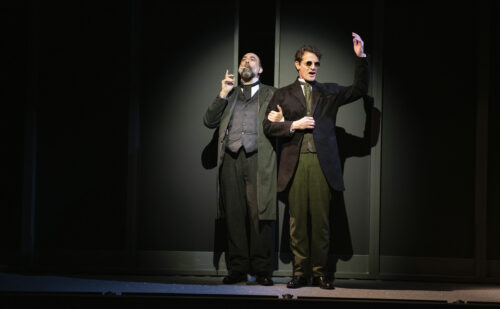 At left, James Zannelli as the divorcee and Mark H. Dold as Bobby Lehman in GableStage’s “The Lehman Trilogy.” (Photo courtesy of Magnus Stark)