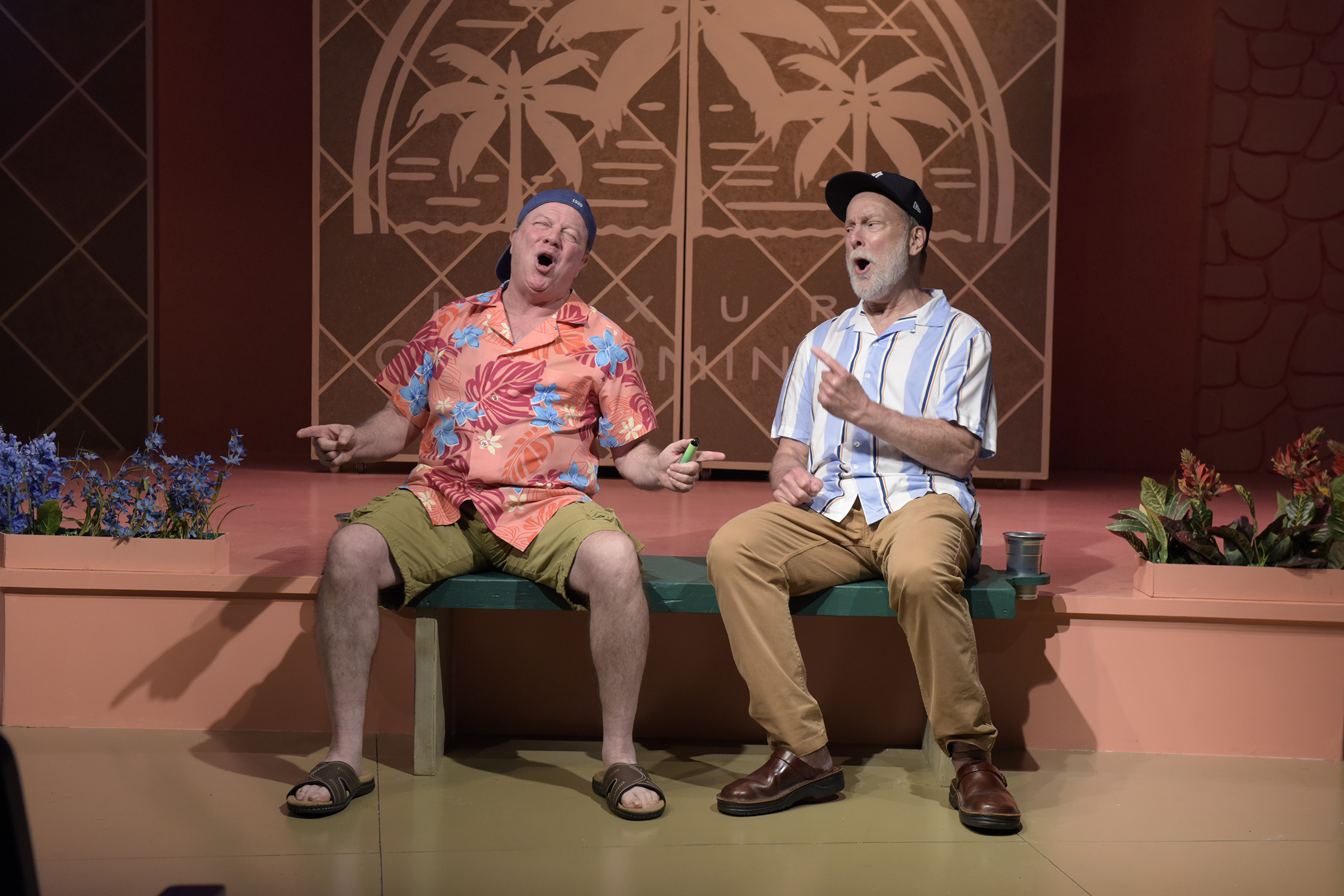 Longtime GableStage designer Lyle Baskin created the set, fitting a pair of condos on either side of the central area where Mo and Marty await their cars, and Iris and Louise take off on their extended road trip. The yellow and blue condos, decorated by Clara Fath, are true to form for an upscale 55+ community. That central area and Mo’s “Tesla,” however, are cartoonishly at odds with the condos.
