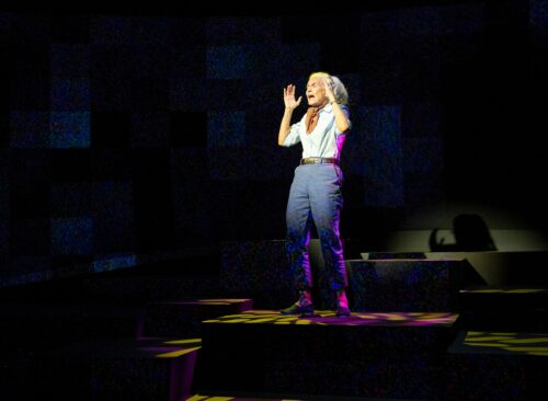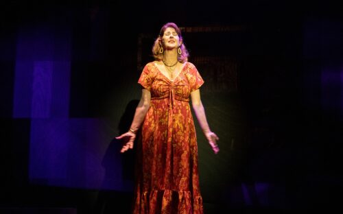 Throughout Diana’s introduction, a soundtrack plays – the recognizable rhythmic hand-clapping beat of the theme from the 1976 movie “Car Wash.” Gardner as Alice is upstage bathed in a single muted light coming from overhead (Tony Galaska’s lighting throughout is pure perfection). She’s dancing and doing The Hand Roll, a disco dance move popular in the mid-1970s – a rolling motion of the hands, fist over fist.