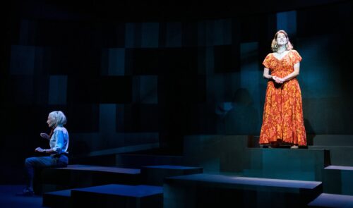 Scenic designer Frank J Oliva’s playing area for the two characters is made up of about two dozen staggered, black pedestal-like cubes attached at slightly different heights. Not only is Auburn’s script intense for the two actors with its monologues and character arcs, but they must navigate these many different playing levels.