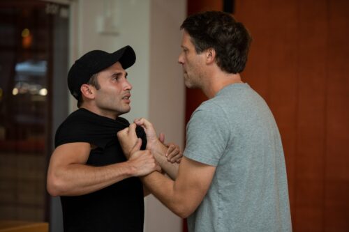 Ernesto Reyes’s Justin (left) tries to defend himself from Caleb Scott’s David in the world premiere of “Borrowed.” (Photo courtesy of Roger Alejandro Gonzalez)