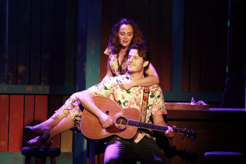 Kayleen Seidl as Rachel and Sam Sherwood as Tully in “Jimmy Buffett’s Escape to Margaritaville” at Actors’ Playhouse at the Miracle Theatre. (Photo courtesy of Alberto Romeu)