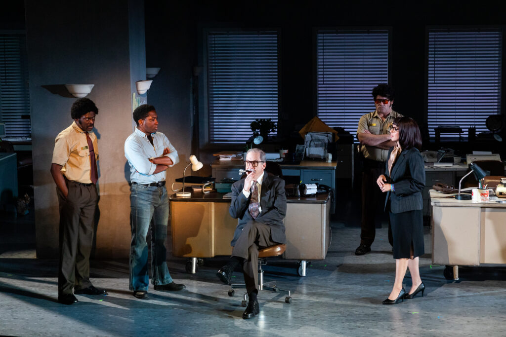 The Miami Herald newsroom, which doubles as police headquarters, is wonderfully executed for the time period by set designer Tim Mackabee enhanced by the throwback era prop design by Ana Maria Morales. Kudos to costume designer Celeste Jennings for capturing Buchanan’s love for pantsuits along with wig designer Carol Raskin whose different styles help create individuality for the multiple cast of supporting characters. Lighting designer Marie Yokoyama casts Miami 1980 in a blue haze, then ignites menacing red fire outside the building when the city is under siege. Co-sound design by Bailey Trierweiler, Daniela Hart, and Noel Nichols of Uptown Sound captures the era.
