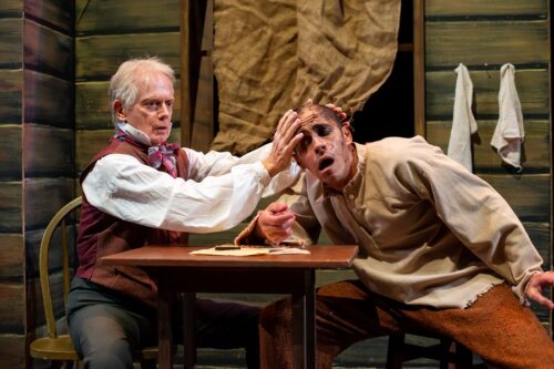 Barry Tarallo as De Lacey befriends Gabriell Salgado’s Creature in a scene from Zoetic Stage’s “Frankenstein,” playing through Oct. 31, 2021. (Photo courtesy of Justin Namon)