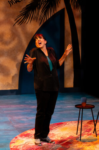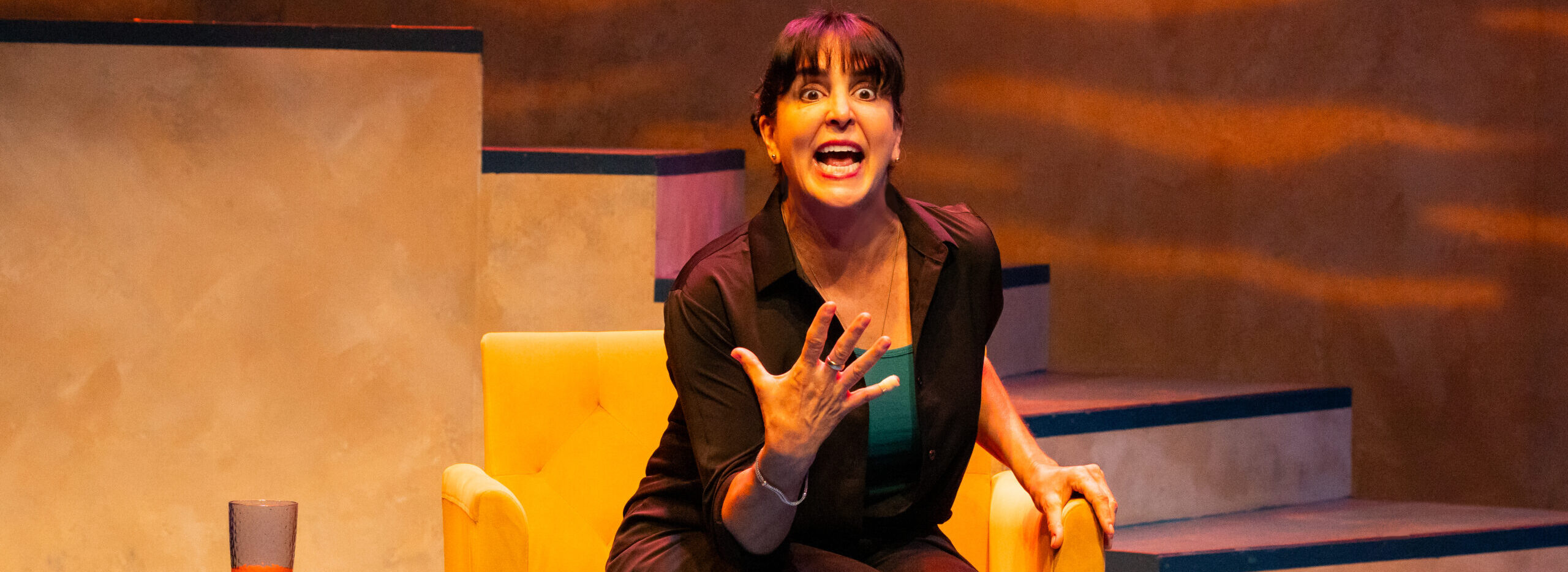 Local actress-comedian-playwright Elena María García in Zoetic Stage’s one-person original play “Cuban Chicken Soup: When There’s No More Café” through Sunday, May 19 at the Carnival Studio Theater inside the Adrienne Arsht Center, Miami. (Photo by Morgan Sophia)
