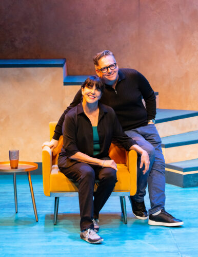Co-playwrights Elena María García and Zoetic Stage Artistic Director Stuart Meltzer on the set of “Cuban Chicken Soup: When There’s No More Café.” (Photo courtesy of Morgan Sophia)