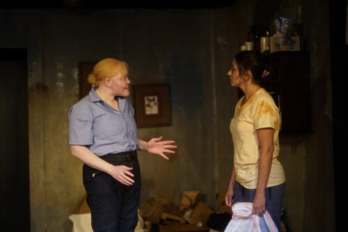 Max (Thiana Berrick) shows up at the house of Perdita (Lena Marie Gonzalez) in Main Street Players’ world premiere of Armando Santana’s “Here, Chew, Chew.” (Photo by Gabriel Medina)