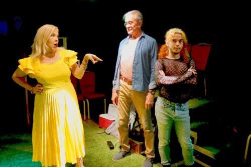 Enrique Galan, left, as Bryce Winning, confronts his father Randall (Bill Schwartz) and Randall’s young lover, Dante (Alice Rodriguez) after showing up at their hotel room in Ricky J. Martinez’s “With the Swallows.” (Photo by Darcy Hernandez-Gil)