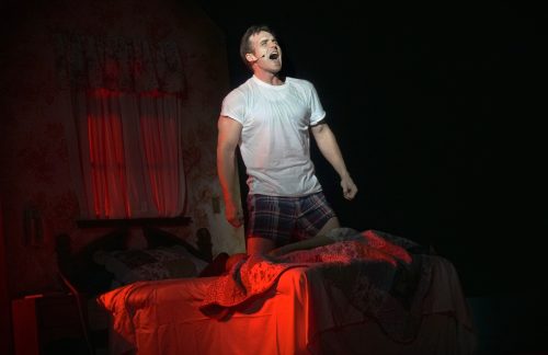 Clay Cartland was the trapped weatherman in Slow Burn Theatre’s “Groundhog Day.” (Photo courtesy of Rodrigo Balfanz)
